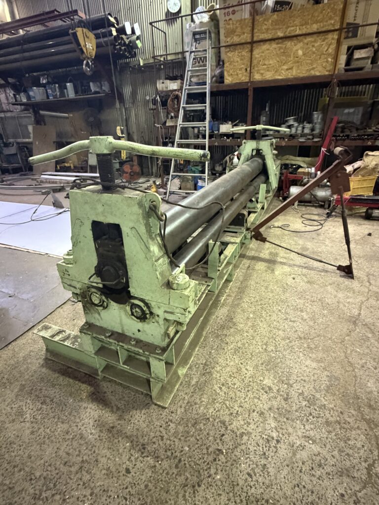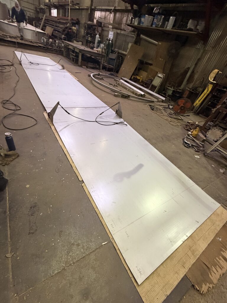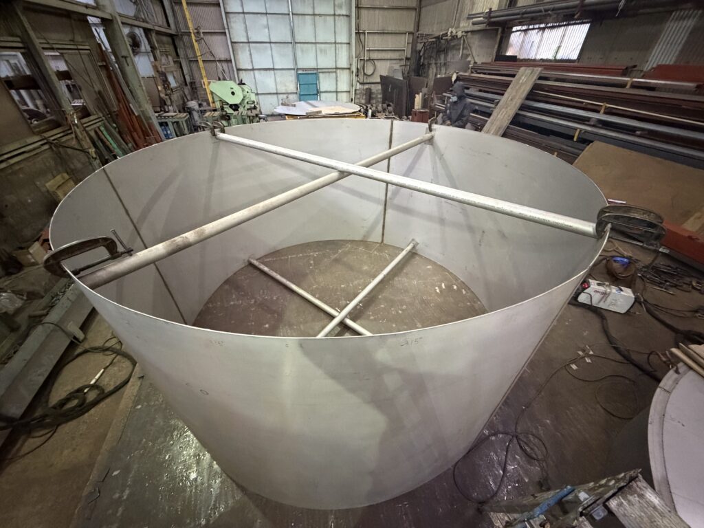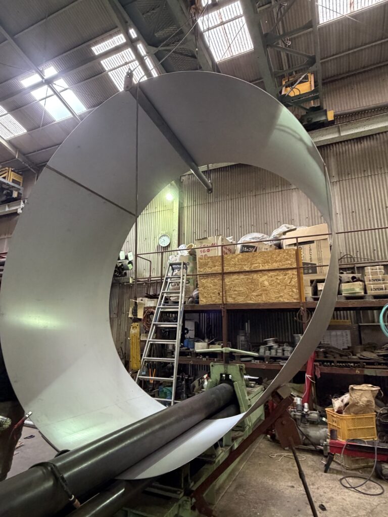 こんな感じで円筒になっていきます。これも板をただ機械に通せば良い訳ではなく、径にぴったりの板を用意する(溶接して繋いで作るので、歪みも計算に入れなければなりません)、図面通りのRに合う様機械もセッティングが必要です。長年の経験と知識が必要な仕事です。本当に熟練の職人さんには頭が上がりません。